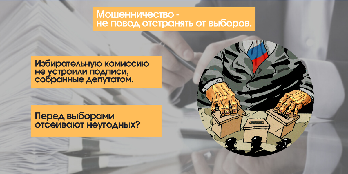 Человек, посвятивший жизнь решению проблем населения не только своего города, но и всего региона, - не допущен к выборам по причине того, что Избирательную комиссию не устроили подписи, которые удалось собрать кандидату. Но в это же время до выборов допускается ранее судимый, потративший несколько миллионов государственных рублей и 15 лет скрывающийся заграницей кандидат.