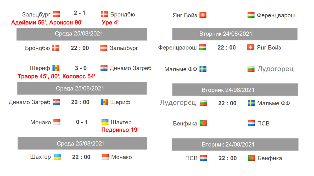 --- В Лиге Чемпионов стартовали матчи последнего раунда квалификации. Кто сыграет в плей-офф? В групповой этап попадут 6 команд-победительниц. Напомню, в прошлом сезоне в основном турнире играли 3 клуба: Зальцбург (3 место), Шахтер (3 место), Ференцварош (4 место). Переходим к результатам вторника. Замечу, что хозяева за матч нанесли 30 ударов и забили 2 гола, гости ударили 2 раза и забили 1 мяч. Клубы ранее не пересекались. Вторая игра состоится через неделю. Молдаване с одним молдаванином в составе уверенно побеждают в первой игре и увеличивают свою серию до 9 игр без поражений. Адама Траоре из Мали сделал дубль. Вспомним историю. Клубы последний раз пересекались в 2013 году, тогда дважды победило в квалификации Лиги Чемпионов Динамо 4:0. Во Франции команда де Дзерби увезла минимальную победу, но правило выездного гола с этого сезона уже не действует. Второй гол забивает новичок бразилец Педринью. Ответные матчи состоятся 25 августа. В среду первые встречи раунда плей-офф проведет Я