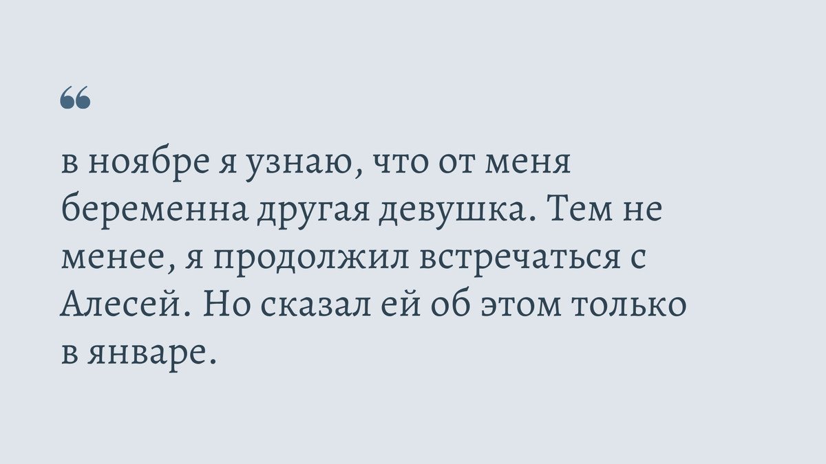 Затем, в ноябре я узнаю, что от меня беременна другая девушка. Тем не менее, я продолжил встречаться с Алесей. Но сказал ей об этом только в январе. Изначально, она, как очень впечатлительная девушка (скорпион по гороскопу, эмоциональная в общем) была готова расстаться. Её шок нельзя было передать словами. Но по итогу все уладилось. Я ребёнка не вижу и вообще не имею в нему никого отношения. То есть, он нас и наши отношения никак не касается. Но ей эта тема очень неприятна.