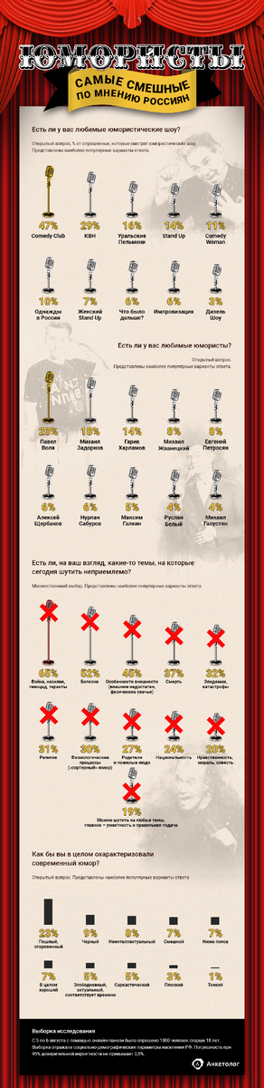 Мы выяснили, какие юмористические шоу россияне любят больше всего, каких комиков считают наиболее смешными и как бы в целом охарактеризовали современный юмор. Подробности — в новой инфографике «Анкетолога». Если вы тоже хотите принять участие в исследованиях за вознаграждение, регистрируйтесь в онлайн-панели «Анкетолог» по ссылке.