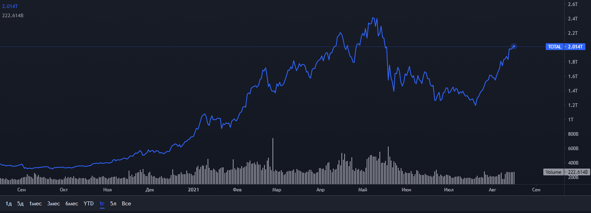 Крипто-рынок возвращает рыночную капитализацию в 2 триллиона долларов на фоне роста биткоина По данным CoinGecko, который отслеживает более 8800 монет, рыночная стоимость криптовалют в субботу выросла до 2,06 триллиона долларов. Биткоин достиг 48152 долларов, самого высокого уровня с 16 мая, поскольку он продемонстрировал устойчивость выше своей 200-дневной скользящей средней. Движение вверх произошло даже после того, как криптовалютная индустрия не смогла добиться изменения правил налоговой отчетности за криптовалюту в законопроекте об инфраструктуре США, оставив нетронутыми формулировки для широкого надзора за виртуальными валютами в законодательстве, принятом Сенатом во вторник.