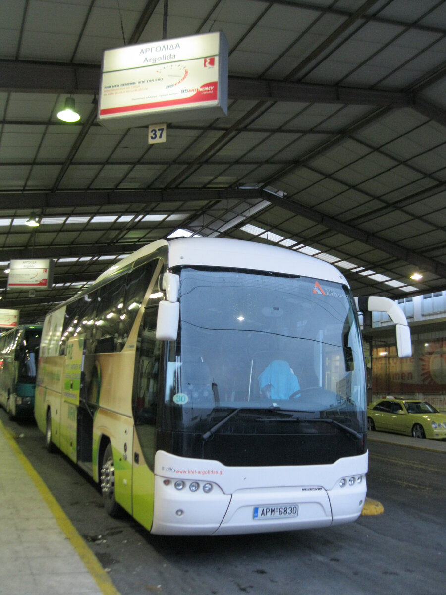 В октябре 2013 года автобусы в Микены отправлялись с так называемого Терминала A или Kifisou Bus Terminal. Начитался в путеводителях и интернете про хаотичность этого автовокзала и немного не рассчитал время приезда туда. Думал, что придется долго разбираться на месте, но все оказалось просто. Остановка автобуса №051, на котором можно доехать до автовокзала, оказалась в нескольких кварталах от моей гостиницы в районе площади Metaxourghio. Вышел из отеля еще до рассвета, шел до остановки мимо многочисленных магазинчиков, где продают недорогую одежду. Автобус пришел быстро и уже через минут 20 он приехал на автовокзал. Билетные кассы оказались слева от остановки автобуса. Но там я не обнаружил кассы по продажи билетов в Микены. В информационном бюро мне назвали номер платформы, где находится офис KTEL (государственной автобусной компании) провинции Арголида и с которой отправляются автобусы в Микены, Аргос, Нафплион, Эпидавр. Билеты продают в офисе на платформе. Платформу нашел без труда, ничего хаотичного на этом автовокзале я не увидел: провинциальные KTEL имеют свои платформы, чтобы здесь заблудиться, надо быть полным дураком. Немного опоздал, первый автобус ушел всего 15 минут назад. Следующий будет через 1,5 часа. Купил билет, обследовал автовокзал: весь необходимый сервис имеется: кафе, супермаркет, зал ожидания. На остановке городских автобусов и экспресса в аэропорт имеется будочка по продаже билетов. Камеры хранения имеются у каждой компании KTEL на платформах.