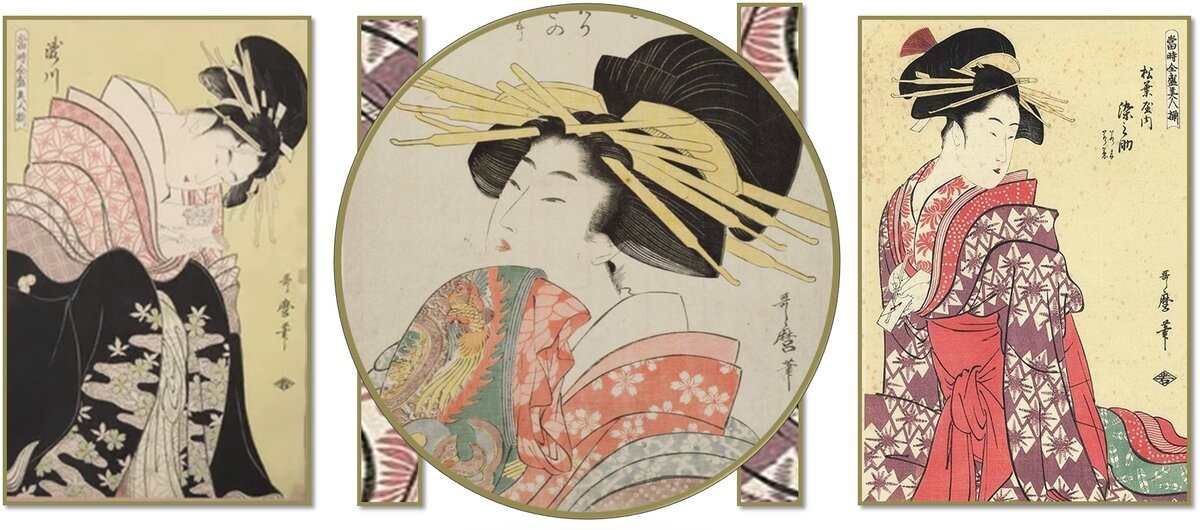 Каждая деталь, её цвет имел определенное значение и поэтому всё должно было хорошо видно. А это уже задача композиции. Получается, что художник, прежде чем рисовать, должен был предусмотреть всё. На каком месте кимоно будет этот элемент? Виден ли будет цвет? А сам рисунок? Не закроют ли его складки?