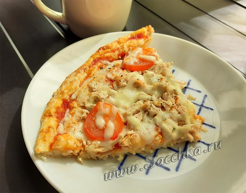 ПП пицца приготовлена с курицей, помидорами и сыром на творожном тесте. Вкусно очень!