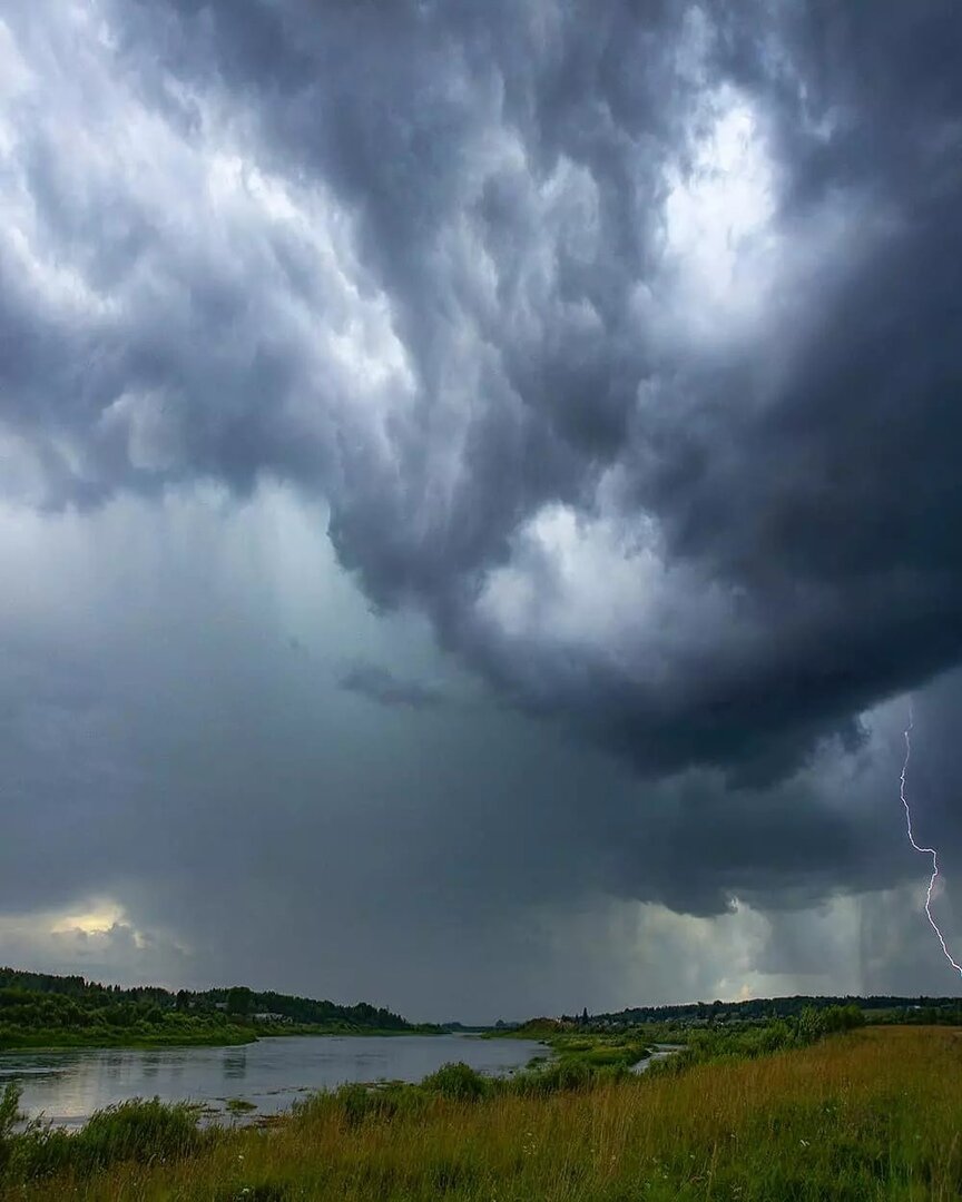 Скорость побольше, музон погромче, бит пожестче, - столб пыли за спиной. Асфальт закончился, а двухсоткилометровое грунтовое ралли только начиналось. По мере удаления от моря облака уплотнялись; света становилось все меньше. На противоположном берегу реки Онеги “замаячил“ очередной деревянный шедевр. На этот раз в деревне Турчасово. В который раз решил щёлкнуть старинный храм на фоне сгущающихся туч (фото потом покажу). Тут начал накрапывать дождик, а горизонт стремительно наливался "свинцом". Загремело, засверкало... Нужно было побыстрее удирать от стихии, чтобы не месить грязь на раскисшей дороге. Заодно хотел попробовать сфотографировать грозу со стороны. Но через несколько километров стало понятно, что я попал в окружение нескольких фронтов - бе
