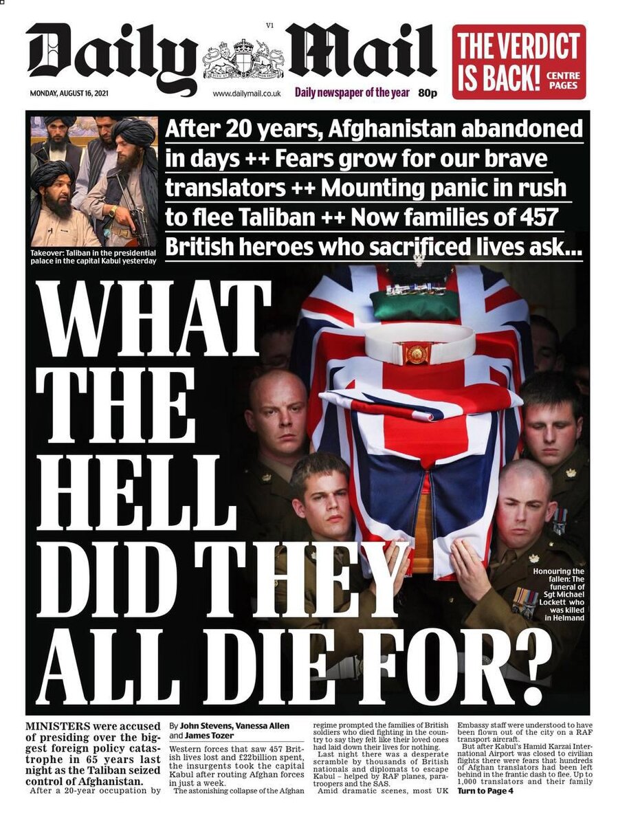 ...и осмеливаются задавать неприятные вопросы: За что, чёрт побери, они все умерли? Министры обвиняются в величайшей катастрофе в международной политике за последние 65 лет. После 20 лет из Афганистана сбежали за несколько дней. Между тем, выяснилось, какое оружие - самое страшное для американцев. нет, это не всякие гиперзвуковые ракеты и прочие Кинжалы. Это - шлепанцы! США два раза за полвека проигрывали войны и оба раза умудрились проиграть людям, воюющим в шлёпанцах.