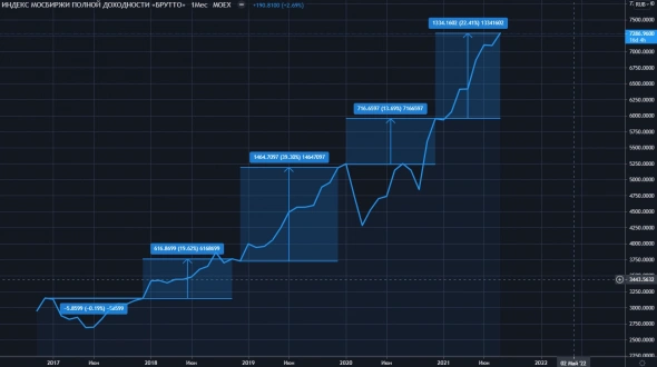 За 5 лет индекс полной доходности MOEX (MCFTR — учитывает дивиденды, но не учитывает налоги) вырос в 2,6 раза с 2761 до 7286, обеспечив среднегодовую доходность 21,4% (CAGR).