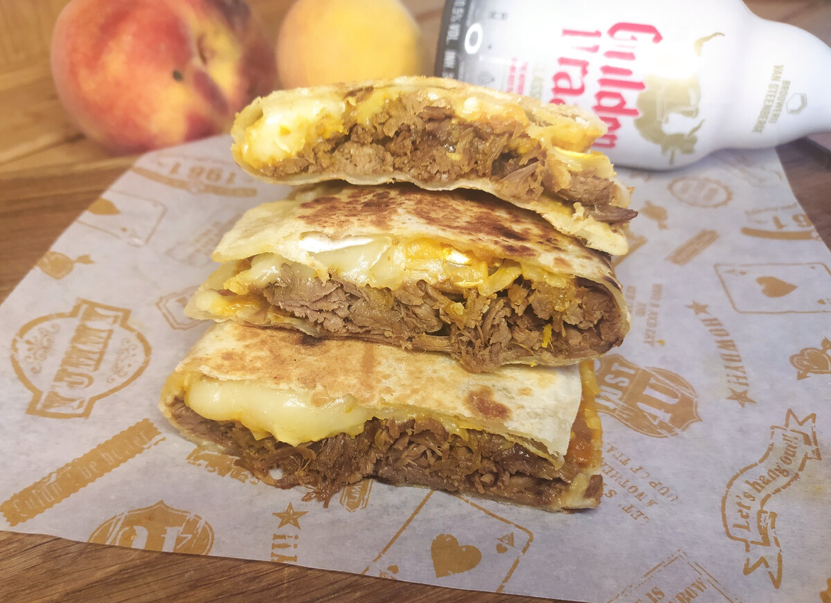 Нежнейшая говядина, барбекю с персиком и ананасом, чеддер и сыр бри, завернутые в тортильи и обжаренные на гриле. 3 шт. тортилий