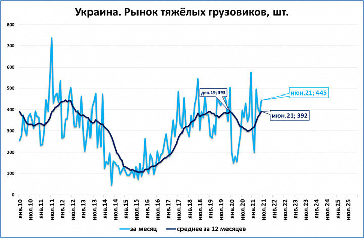 В июне на рынке Украины было продано 445 тяжёлых грузовиков. За первое полугодие продано 2225 шт. против 1193 шт. в первом полугодии прошлого года. Если темпы первого полугодия (+87%) сохранятся до конца года, то в 2021 году результат (6,9 тыс. шт.) будет лучшим с 2008 года. Стоит отметить, однако, что темпы, по всей видимости, будут снижаться, так как эффект низкой базы, действовавший в первом полугодии, будет сходить на нет. Замедление темпов заметно уже сейчас. Если в марте-апреле они превышали 150% (рост более чем в 2,5 раза), то по итогам июня опустились до 60%. Вывод: рынок Украины может показать в 2021 году лучший результат с 2008 года, то есть за последние 13 лет. P.S. Ориентироваться в моих статьях, заметках и видео удобно через НАВИГАТОР Раньше всего материалы публикуются в Дзен и Телеграм Телеграм : https://t.me/m2econ Дзен : https://zen.yandex.ru/m2econ Подписывайтесь! Буду благодарен вам за лайки и комментарии
