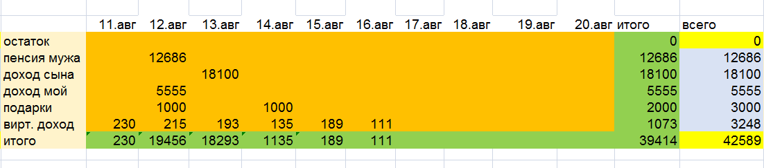 Доброе утро, мои дорогие подписчики и просто читатели канала! Говорят, что понедельник день тяжелый 🤣🤣🤣, а у нас понедельник получился не тяжёлым, но и радостным и грустным одновременно. Итоги бюджета за 16 августа. Доход. Доход небольшой, 111 рублей. Так в таблицу и запишем. И 🙏💕СПАСИБО говорю всегда и всем, кто читает наши итоги. Расход. А вот расход был большой. Во-первых, мёд. За 🍯мёд отдали 900 рублей. Даже не знаю, сколько стоит в магазине, в любом случае не думаю, что это дорого. Да и это лучшее лекарство. Во-вторых, мы совершили вчера "Полёт к богатству". Здесь конечно траты больше виртуальные и по сути переложили из одного кошелька в другой. Но жизнь показала, что копилка или финансовая подушка должна быть. И в -третьих, мы вчера в конвертике подарили 1500 рублей в подарок. Да, мы вчера были в гостях. Не стали отказываться от редких(в последнее время) встреч. И как всегда всё прошло как в старые добрые времена. Посидели, вспомнили молодость, обменялись новост