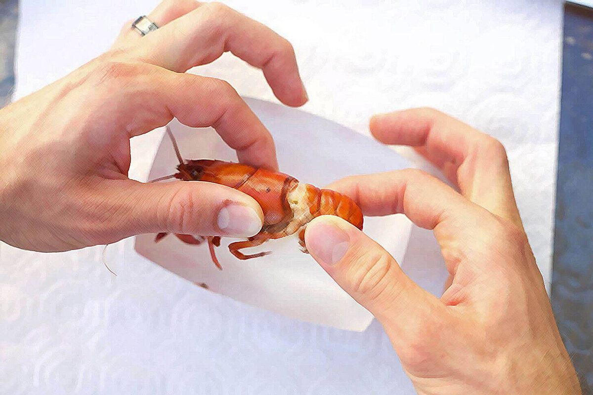 Если вы впервые купили вареных раков, то зададитесь вполне логичным вопросом: а как же все таки правильно их есть? В данной статье мы подробно расскажем как это делать, а если во время прочтения у вас рядом будет стоять тарелка свежесваренных раков - будет только лучше. Так вы сможете сразу приступить к практике. Итак, начнем. 1. Сначала необходимо оторвать ходильные ножки и клешни. Мясо из ножек можно выдавить зубами, а клешни можно либо разломить руками, либо разрезать ножницами (если они довольно крупные). Ни в коем случае не выбрасывайте их, так как в клешнях, особенно у крупных раков, находится довольно большой кусок мяса. 2. Далее нужно отделить грудную часть от шейки (хвоста). Одной рукой возьмитесь за край грудной части, другой рукой за край шейки и, аккуратно, вращательным движением "откручиваем" хвост от груди рака. Делайте это осторожно, так как может вылиться сок (бульон), который, кстати, очень вкусный! Его необходимо будет выпить, но это на ваше усмотрение. Шейку отклад