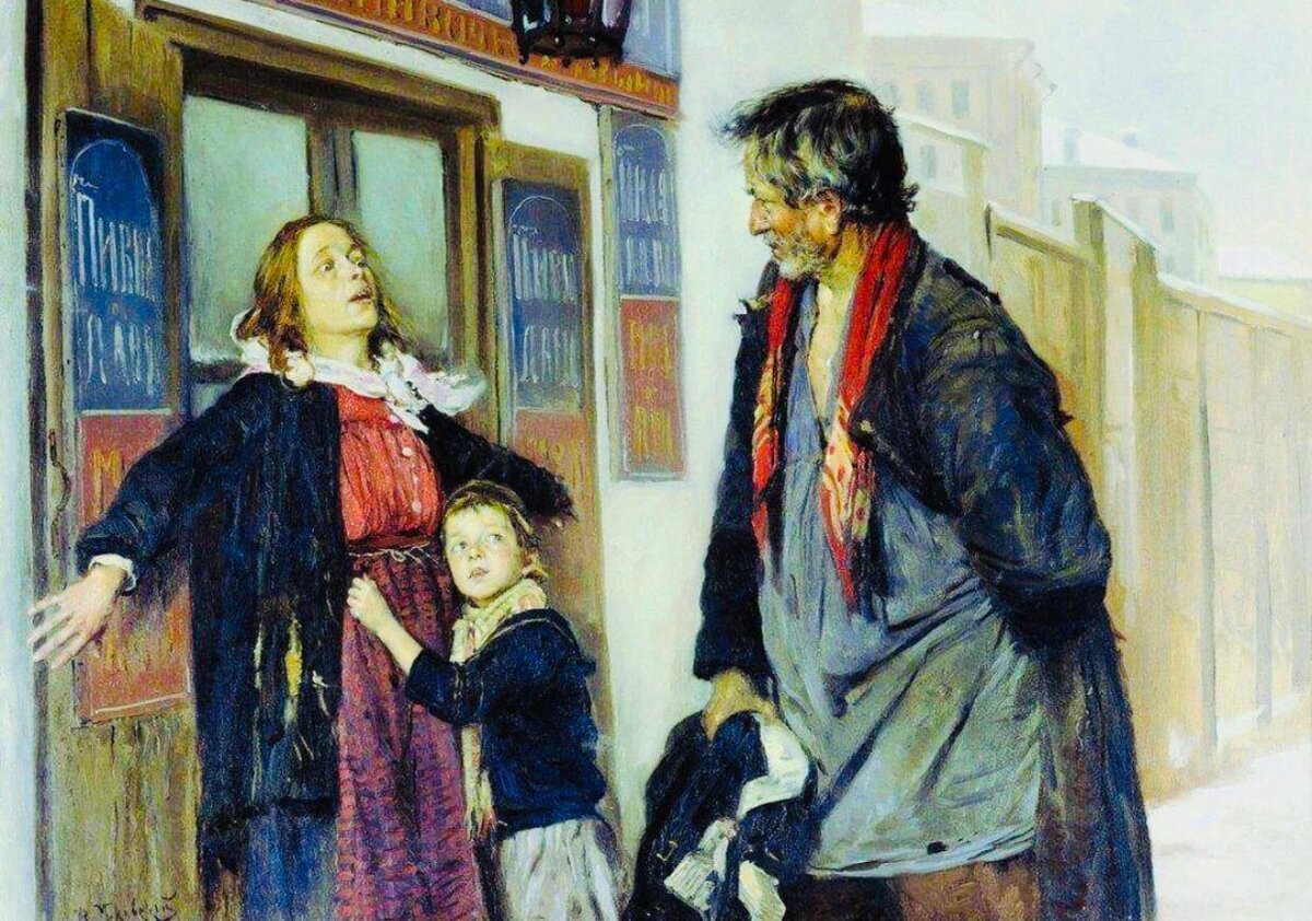 "Не пущу!" Владимир Маяковский 1892год. В центре картины изображена женщина которая с остервенелым взглядом преграждает путь к своему мужу в маленький кабак с вывеской "Пиво". Мужчина к этому времени, скорее всего, пропил уже по кабакам все деньги семейства. О чем говорит рваная старая одежда не только на нем, но и на его семье. Он подходит к трактиру с последней оставшейся у него ценной вещью, со своим парадным китилем. Раньше этот человек был военным, и показывает насколько низко он пал. Он с ненавистью смотритна свою жену. И его не трогают даже испуганные глаза сына, который совершенно не узнает своего отца. А мальчик же пытается своим маленьким тельцем как-то укрыть мать, от готовившего наброситься на нее мужчины. Все это происходит в каком то отдаленном, захолустном городке, о чем нам говорят вот эти серые высокие дома, которые огорождены каким то грязным деревянным забором. И вокруг не совершенно никого, и никто не помет защитить или помочь этой несчастной женщине, которая вы