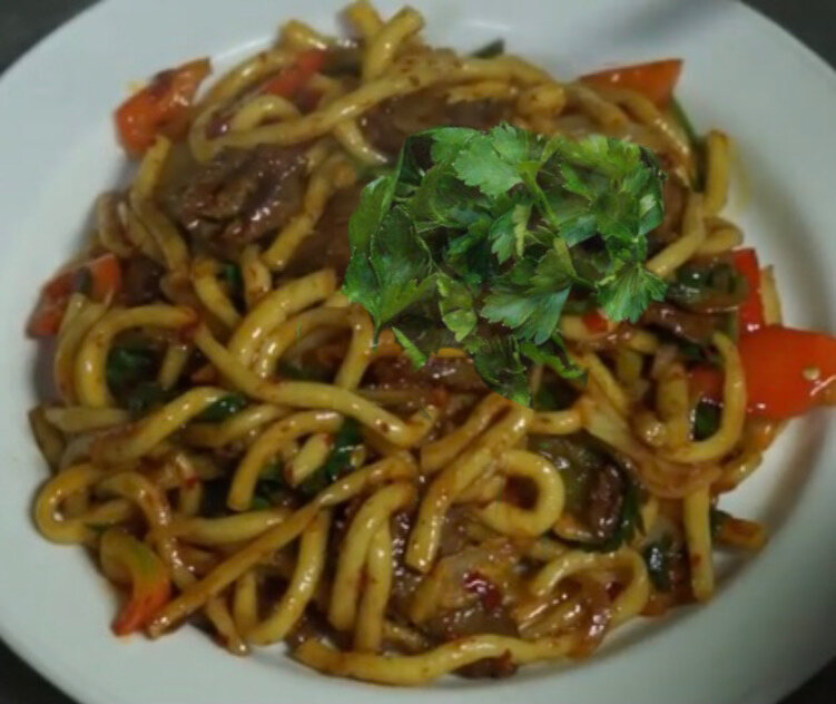 рецепт : лапша домашняя 300 гр репа 2 шт лук 2 головки перец красный 100гр мясо говядина 200гр помидоры 200гр морковка 1шт 50гр (примерно ) Специи для ставим вариться лапшу 2 этап бросаем мясо в сковороду и обжариваем минут 5 3 этап закидываем лук обжариваем до золотистой корочки 3 этап добавляем репу нарезаную кубиками и все перемешиваем тушим 5 минут 4 этап добавляем морковь нарезаную кубиками , тушим 10 минут все перемешиваем 5 этап берем перец удаляем семена , надрезаем кубиками небольшими тушим 7 минут 6 этап берем помидоры нарезаем на терке чтоб получилось пюре добавляем немного воды (150мл) и тушим 10-15 минут под закрытой крышкой на медленном огне 7 этап достаем лапшу , добавляем к овощам и мясу и обжариваем чтоб лапша немножко поджарилась 8 этап специи добавляем : соль , перец ,Зира , бадьян , гвоздика , сушеная зелень , молотый чеснок готово ! приятного аппетита ❤️