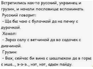 — Слющай, дарагая! Пятнадцать раз ганарэя, адынцать раз сифилис… Мне толко еще мурашек на спине не хватало! *** Встретились американец, русский и грузин. Разговор зашел о женщинах.