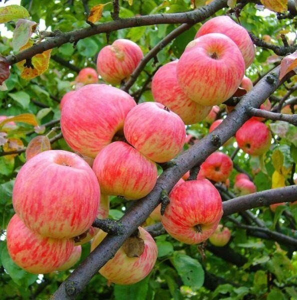 сорта Коричное полосатые: низкорослое дерево с круглой кроной. Листья темно-зеленые, осенний окрас желтый. Яблоко округлой формы, красного цвета, мелкокочанной текстуры. Сорт высокоурожайный, приносит до 5 кг с дерева. Плоды сладкие и сочные. Косточка съедобная, при правильном хранении остается целой. Фото яблони яблони со снятой кожурой: Сорт имеет рыхлую структуру кроны и обильное плодоношение. Побеги золотисто-желтого цвета, верхушечные почки огненно-красного цвета. Шаровидные плоды, около 3 см в диаметре, растут до августа месяца. Ягода имеет сладко-кислый вкус, при этом несладкая, после снятия кожуры на зубах остается натуральный вкус яблок. Из-за мощного развития побегов, дерево склонно к сбрасыванию завязей, поэтому надо удалять ветки, растущие на южную сторону яблони. В уходе яблоня не капризная, нуждается в рыхлении кроны, подкормке и своевременных поливах, умеренном поливе в период вегетации, мульчировании. Урожайность зависит от сорта яблони: Плодоносит яблоня Коричное до 25