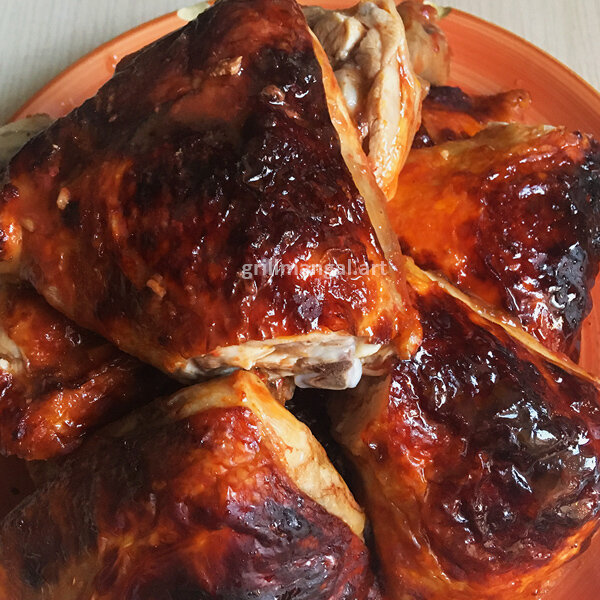 Окорочка замаринованные в томатном соке и запеченные в духовке. Вкусный рецепт, и корочка получается не жесткой, а очень мягкой. А уж соус получится шикарный. Ингредиенты: С солью не переборщите, сначала попробуйте сок — вдруг он уже достаточной соленый. Тогда хватит и 2 чайных ложек на все 2,5 кг окорочков. Специи вы можете подобрать и другие, которые Вам больше всего нравятся. И так же как обычно пишут — по вкусу подбираете количество. Кому-то нравится может быть перченное, а кто-то вообще не любит класть перец ни в какие блюда. Суть в самом процессе. Процесс приготовления Промываем и обсушиваем окорочка. Немного солим (посыпаем солью и хорошенько растираем соль по всему окорочку), и оставляем в тепле, накрыв пленкой. Либо сразу их поместить в емкость для маринования. Пусть лежат пока же займемся соусом. В сотейник наливаем томатный сок, ставим на сильный огонь, выпариваем примерно треть сока. Убавляем газ до среднего. Добавляем в сок все специи, помешиваем регулярно. Со стенок сотей