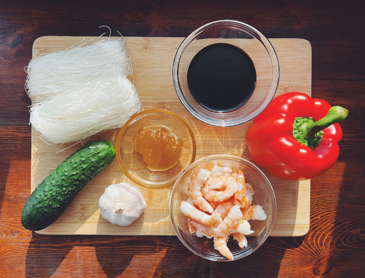 Фунчоза – лапша, пришедшая к нам из Азии. Лапшу редко готовят как отдельно самостоятельное блюдо, потому что она не обладает ярко выраженным вкусом. Фунчозу еще называют «стеклянной» лапшой, потому что она при варке становится прозрачной и напоминает стекло. Стоит отметить, что фунчоза содержит в себе множество полезных для организма человека витаминов и микроэлементов. Фунчозу можно добавлять во все блюда, она не испортит их, а только добавит изюминку блюду. Поэтому, добавив к ней креветки, соевый соус, овощи – получим вкусное и полезное блюдо. Ингредиенты: 1. Фунчоза – 200 гр. 2. Креветки (очищенные и размороженные) – 150 гр. 3. Болгарский перец – 1 шт. 3. Огурец (небольшой) – 1 шт. 4. Чеснок – 3 зубчика. 5. Соевый соус – 9 ст. л. 6. Мед – 2 ст. л. 7. Масло растительное – для жарки. Пошаговый рецепт приготовления: 1. Подготавливаем фунчозу согласно инструкции на упаковке. Обычно я заливаю кипятком и даю настояться 7 – 10 минут, затем сливаю воду, откидываю фунчозу на дуршлаг и промыв