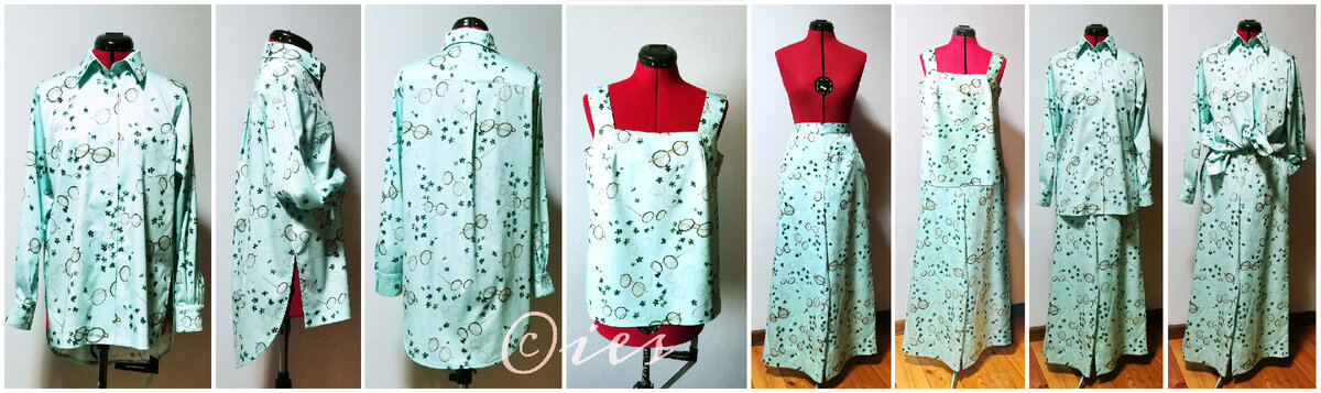 3) рубашка с накладными карманами на груди (подобрала рисунок настолько хорошо, что на фото их не видно) и разрезами в боковых швах разной формы.