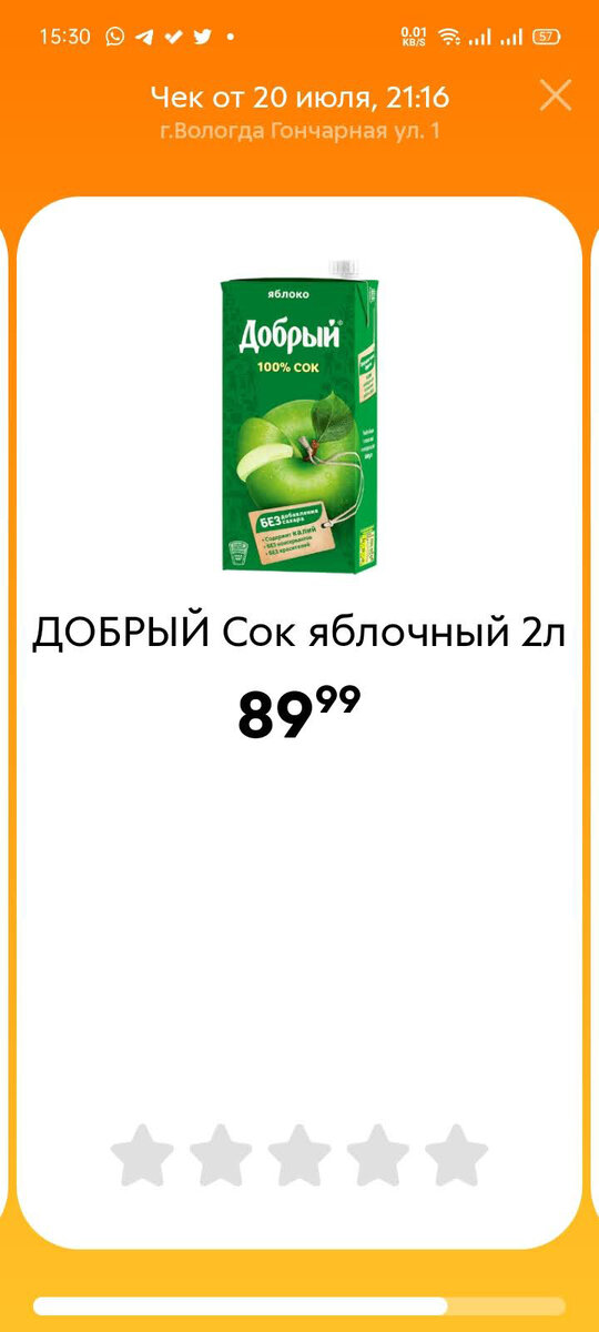 Решил поискать информацию в приложении. «Пятёрочка» сделала в приложении интересную замануху: можно оценить совершенные покупки и получить еще немного баллов. И вот что обнаружилось (скриншоты прилагаю): 20 июля в 20:57 я покупаю Сок «Добрый» в г. Вологде, а уже 21 июля 21:07 в г. Великие Луки я решил купить 5 килограмм сахара. И опять же вечером 22 числа я снова закупаюсь в Вологде.