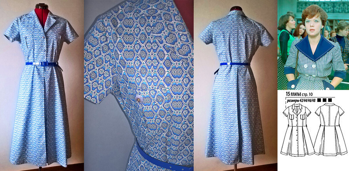 Сшилось хлопковое платье-рубашка по мотивам легендарного платья Людмилы Прокофьевны (к/ф "Служебный роман"). Ни крой, ни детали полностью не копировала, просто сохранила общий силуэт, в духе оригинала. Ткань – набивной хлопок с эластаном, тонкий и сухой – хорошо держит форму и плохо утюжится. Поэтому отстрочила на 1 мм ребра складок юбки и складок на карманах. Винтажные пуговицы из 80-х.