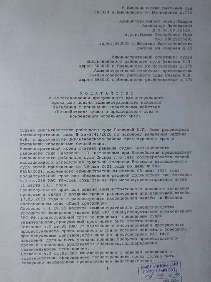 Добрый день! Есть хорошая поговорка- рука руку моет,но для применения к судебному произволу я статью назвал именно так.Теперь по порядку.В продолжении темы "Как остаться человеком в правовом государстве" решил призвать к ответу мантии носов Емельяновского районного суда.Подал вот такое административное исковое заявление с ходатайством о восстановлении пропущенного процессуального срока. опять же в связи с процессуальной непорядочностью судей Емельяновского районного суда вынужден подписать -"копия верна" и стал бояться,что откажут в восстановлении процессуального срока,но судьи ведь умнее и пошли по стандартной схеме отказали с мотивировкой,что проверка законности решений,действия/бездействия/ осуществляется в ином порядке ,забыв,что кассационная инстанция подвела под сомнение решение суда первой инстанции отменив решение апелляционной инстанции.Подана частная жалоба судья Емельяновского районного суда Адиканко Л.Г. уходит в тень и в бой вступает тяжелая артиллерия - административный