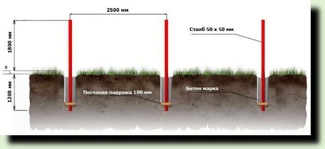 Сетка-рабица реализуется в рулонах, стандартная длина которых — 10 м. Чтобы она не обвисала, по линии забора устанавливают опоры через каждые 2–2,5 м. Следовательно, для одного рулона понадобится 5 столбов. Та часть опоры, которая после установки находится над землёй, должна быть на 10 см выше чем ширина сетки. Сами столбики нужно закапывать в землю на одну треть от их высоты.
