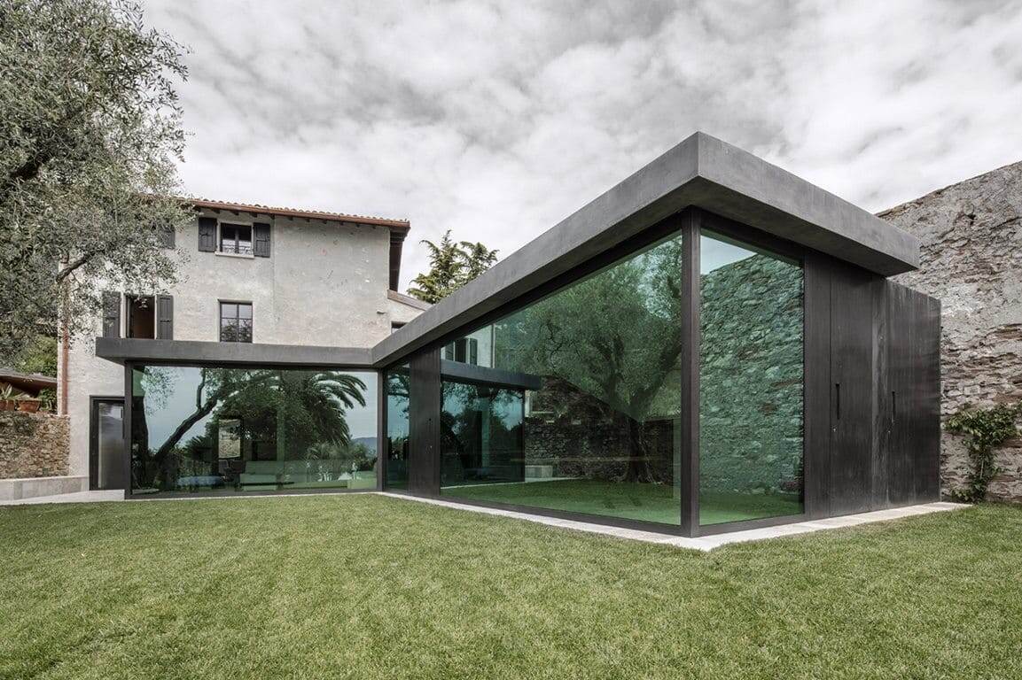 Архитектурная студия Bergmeisterwolf завершила строительство дома на берегу озера Гарда в Италии, отличительной особенностью которого являются вертикальные раздвижные стены, исчезающие в полу, чтобы продолжить жилое пространство в сад. Клиент проекта - экономист из Вены - хотел сделать пристройку, что добавило бы ценности и улучшило бы функциональность дома, первоначально построенного в 1680 году. Студии Bergmeisterwolf, главный офис которой находится в Южном Тироле на самом севере Италии, было поручено расширить площадь дома и оптимизировать связь между внутренними помещениями и большим садом. «Нам нужно было проектировать пристройку таким образом, чтобы она гармонично сочеталась с существующим зданием и они выгодно оттеняли друг друга», - говорят архитекторы. Новый современный одноэтажный блок, построенный из бетона, окрашенного в черный цвет, удачно контрастирует со старым домом, который клиент и его семья используют в качестве летней резиденции. Текстурированная поверхность бетона