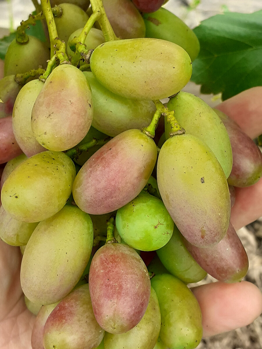 А вот это не шутка - начала окрашиваться гибридная форма Красава. Как бы что тут такого? В Украине она уже почти готова! Да только у нас-то Калужская область, а виноград этот ранне-среднего срока созревания и растёт не в теплице, а в открытом грунте, то есть - из самых поздних, которые у нас успевают вызревать в конце сентября - начале октября. Фото это сделано 5 дней назад и сейчас уже окраска, конечно, интенсивней. Конечно, если он окрасится, это не значит, что сразу будет готов - судят по косточке, чтобы она была коричневая и по присутствию кислоты и сахара в ягодах, но окрашивание ягод - первый сигнал к пути на созревание. Вот такой "ненормальный" сезон: холодная затяжная весна резко перешла в жаркое почти сухое лето, которое скомпенсировало весеннее отставание в росте и даже добавило немного "от себя". Винограда у нас для Калужской области посажено много - запланировано кустов 100, и это - в последние пару лет, потому что мы переехали на новый участок. Гибридные формы почти все з
