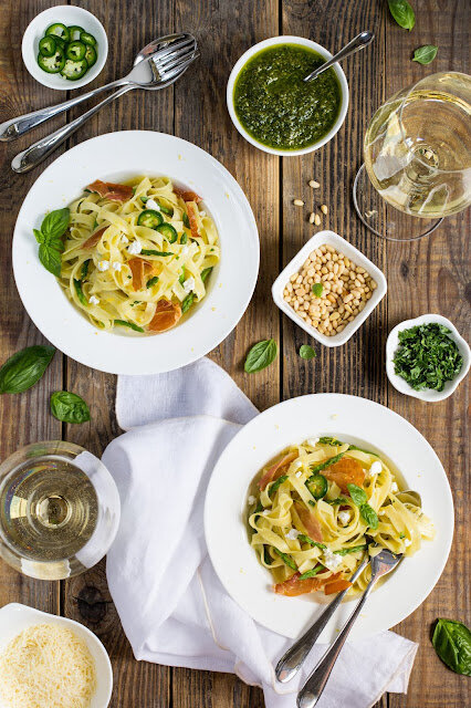Если любите пасты, попробуйте именно эту. Вам должно понравиться)) Понадобятся: 250 г тальятелле 1 пучок зеленой спаржи 150 г прошутто 150 г рикотты 1 ст. л. сока лимона цедра 1/2 лимона (только тонкий желтый слой) 1 перец халапеньо (или другой острый перец) 1/2 пучка петрушки (25 г) соль свежемолотый перец Для соуса песто: 1 большой пучок зеленого базилика (примерно 100 г) 2 ст. л. кедровых орешков 50 г пармезана (натертого) 100-150 мл оливкового масла 1 небольшой зубчик чеснока 1 щепотка соли Для приготовления песто уложить в чашу блендера орешки, базилик, пармезан и 1/2 зубчика чеснока. Добавить 2/3 оливкового масла и измельчить. По необходимости добавляйте еще масло, чеснок и приправляйте солью. Переложите соус в баночку, храните в холодильнике 3-5 дней. Ломтики прошутто уложить на противень, застеленный пергаментом, и отправить в духовку, разогретую заранее до 200 градусов. Отправить противень на верхнюю полку на 3-4 минуты. Ломтики мяса должны подрумяниться и стать хрустящими. З