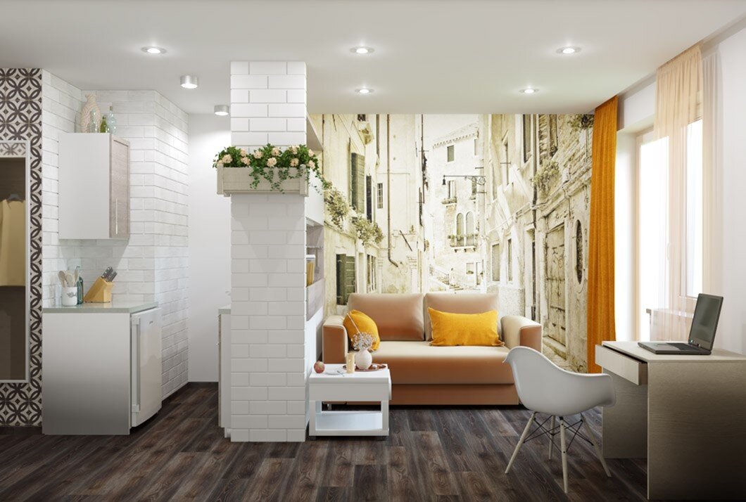 Продолжаем тему кухонь «с изюминкой». Начало читайте здесь>> В этот раз рассмотрим несколько вариантов кухонь в небольшой студии (площадь каждой из квартир не превышает 25 кв. м). Студия – это всегда особая тема, как из-за крохотных размеров, так и тесной взаимосвязи жилого пространства с зоной приготовления пищи. Поэтому создание кухни в студии зачастую оборачивается поиском компромисса между хозяйскими запросами и объективной реальностью. Кухня поперек Итак, первый вариант. Самое необычное в нем то, что плита и мойка стали неотъемлемой частью перегородки, отделяющей зону готовки от жилой части помещения. Верхние ящики образуют подвесную конструкцию, в которой можно хранить посуду и продукты. Просветы между полками делают мебель визуально более легкой и пропускают естественное освещение от окна. Что интересно, в этой крохе нашлось место даже для духовки, однако от полноразмерного холодильника пришлось отказаться. Кухня вдоль Эта кухня расположена вдоль длиной стены, тем более что в ст