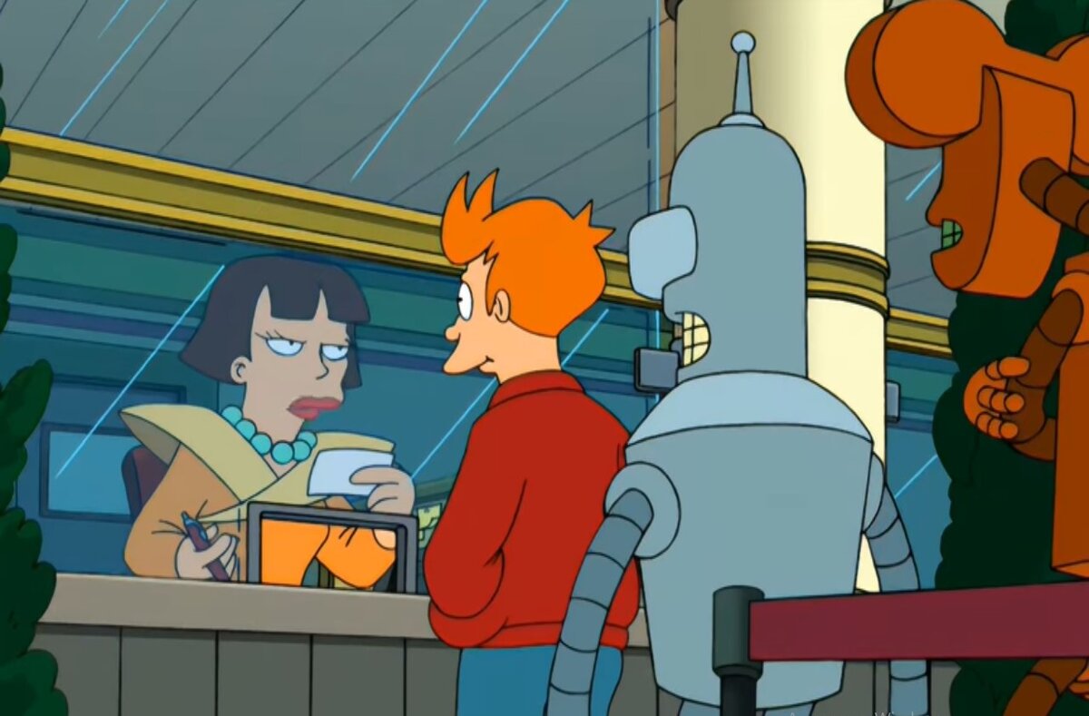 Ситуацию усугубляет, то что здесь еще и легкое ругательство, и переводчик стыдливо его опускает. И тут же какая-то возможно ирга слов, но переводчик переводит ее чисто логически по действиям героев –Фрай по совету Бендера идет в банк открывать счет: