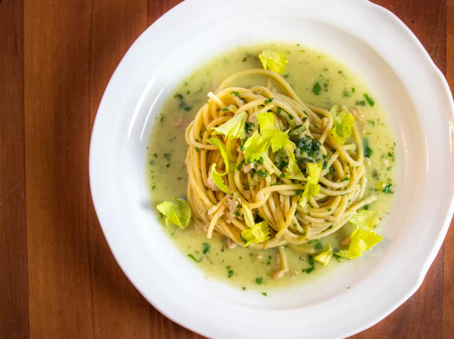 Выключите огонь, добавьте оставшееся масло и петрушку, и энергично перемешайте спагетти, чтобы добавить петрушку и превратить масло в соус. Разложите макароны по четырем порционным тарелкам, равномерно полейте каждую порцию ложкой соуса и моллюсков. Украсить листьями сельдерея и сразу же подавать к столу, минуя дольки лимона, для отжима.