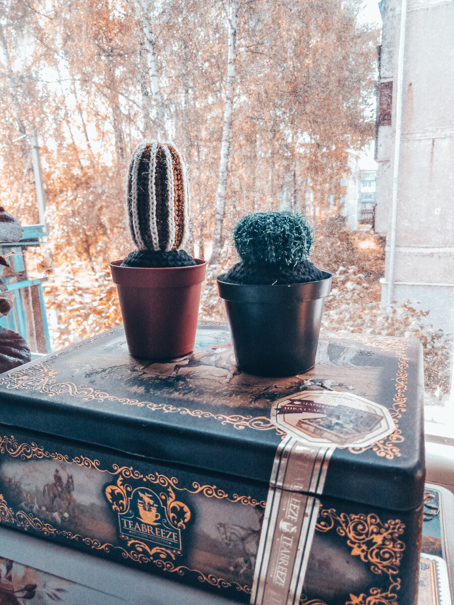 Всем привет 👋 Вы только посмотрите какие красивые кактусы у меня получились😃 А вязать их очень просто👌 Для вязания кактуса я использовала: Итак, вяжем сам кактус. Для этого необходимо связать прямоугольник столбиками без накида поворотными рядами. Высоту кактуса регулируем количеством столбиков, а ширину количеством рядов. Оба кактуса связаны по одной схеме, но из разной пряжи и с разным количеством рядов и столбиков. Когда связали прямоугольник нить не обрезаем, вставляем её в иголку и собираем на неё петельки по верхней стороне прямоугольника, затем хорошенько стягиваем и делаем узелок, потом сшиваем бок кактуса до самого низа. У длинного кактуса выпуклые рёбрышки обвязала белой пряжей ЯрнАрт Кристмас. Землю вязала просто на глазок. Связала сначала круг равный дну горшочка, а дальше вязала ряды прибавок и убавок постоянно примеряя землю к горшочку. Землю и кактус нужно набить наполнителем (холлофайбером). Пришить кактус к земле, вставить в горшочек и, вуа-ля, кактус готов. П