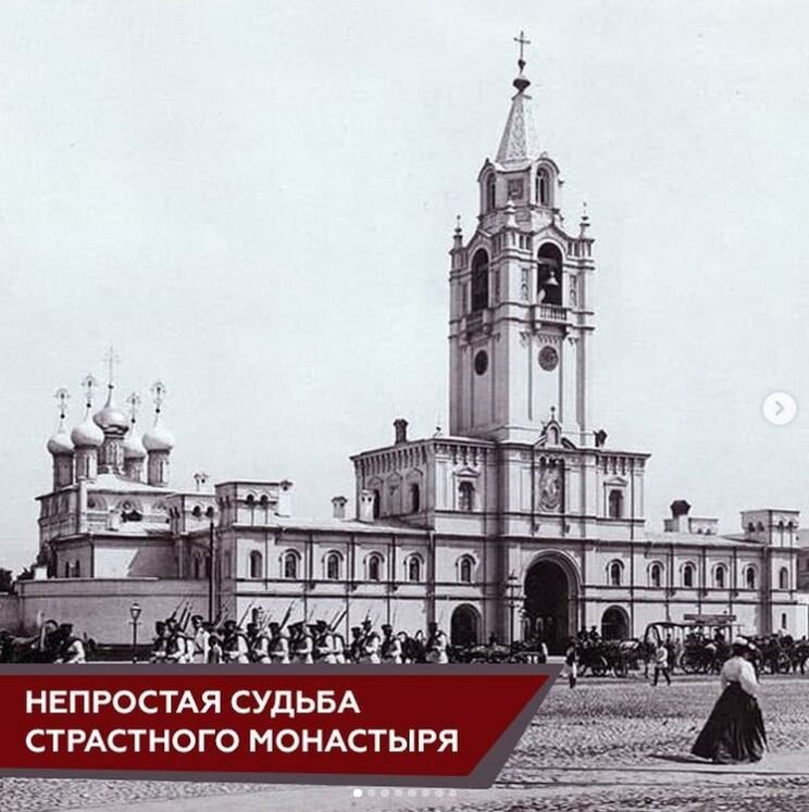 На Тверской улице, где сейчас сквер перед кинотеатром «Россия», когда-то стоял Страстной женский монастырь. Сегодня о нём напоминает только название — Страстной бульвар, а когда-то его постройки занимали почти целый квартал. Женский монастырь был основан в 1654 г. на месте существовавшей ранее церкви у Тверских ворот. По легенде на этом месте встречали прибывшую из Нижнего Новгорода чудотворную Страстную икону Божией Матери. Образ получил своё название в честь орудий Страстей Господних. Их держали два ангела, изображённые возле лика Пресвятой Богородицы. Ансамбль монастыря включал в себя построенную 1652 г. Церковь Рождества Богородицы в Путинках, а через 10 лет на территории монастыря установили надвратную колокольню. Уже в 1701 г. в монастыре значилось 54 деревянные кельи. В 1778 г. монастырь пострадал от пожара. К счастью, чудотворную икону Божией Матери тогда спасли. Уже через год по приказу Екатерины II монастырь восстановили. После 1812 г. монастырь был роскошно отстроен заново.