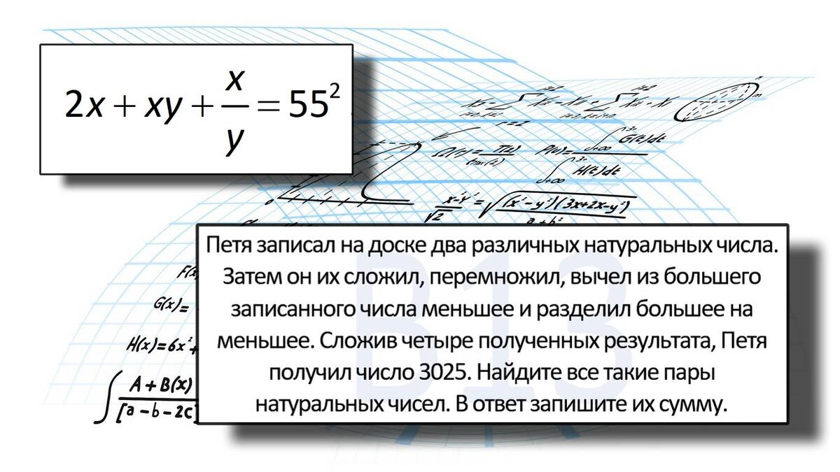 Петя записал на доске два различных натуральных числа. Затем он их сложил, перемножил, вычел из большего записанного числа меньшее и разделил большее на меньшее. Сложив четыре полученных результата, Петя получил число 3025. Найдите все такие пары натуральных чисел. В ответ запишите их сумму. Задача В13 из варианта 5 централизованного тестирования 2021 года по математике. Пусть x и y натуральные числа, причем x > y. Заметим также, что 3025=55². Тогда по условию Так как x и y натуральные числа, то 2x + xy тоже будет натуральным, а, следовательно, и x/y – натуральное число, т.е. x делится нацело на y. Пусть Тогда Последнее равенство возможно при натуральных n (n>1) и y (√n=55, y+1=1, следовательно, y=0 – не натуральное) только в двух случаях: Имеем две пары чисел, которые удовлетворяют условию задачи: (250;10) и (484,4). Их сумма равна 250+10+484+4=748. Ответ: 748. Телеграм YouTube Сайт