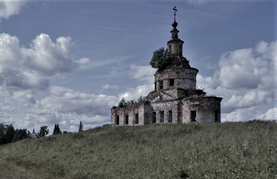 Обойдя его по периметру, мы приблизились к небольшой церквушке, от которой осталась лишь небольшая башенка с крестом на куполе.