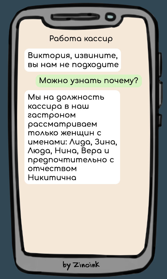 Привет, дорогой друг! Я частенько шучу здесь о том, что многие люди не в восторге от своей работы. Мне бы хотелось, чтобы это было не так, но статистика говорит обратное. Однако, если бы все #начальники обладали чувством юмора, уверен, что число довольных работников быстро начало расти. Кстати, про начальство, которое дружит с юмором — сегодня я подготовил #смс переписки , в которых руководство пытается сгладить отказ в работе с помощью смеха. Надеюсь, что тебя эти #сообщения тоже повеселят. Мне бы очень хотелось, чтобы в рабочем процессе не было места каким-то стереотипам и дискриминации, поэтому придумал шутку на эту тему. Надеюсь, что подобная ситуация возможна только в моей голове, а в реальности подбор персонала происходит иначе. Частенько перед тем как взять сотрудника на работу ему дают тестовое задание. Если человек справляется на ура, его принимают в коллектив, если нет, то отправляют в дальнейшие поиски. Следующее сообщение показывает, что для того, чтобы придумать тестовое з