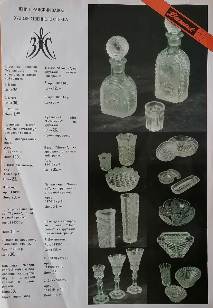 Всем здравствуйте! Сейчас очень много всевозможной информации можно найти в интернете, но можете мне поверить - далеко не все там есть. И я все равно иногда использую материал, тот, который еще собирала до интернета. У меня раньше был каталог советских товаров «Вестник», но так как мне он не был нужен, я вырвала нужные мне страницы, вставила в файлы, а все остальное просто выбросила. Как вы можете догадаться, страницы эти касаются фарфора, керамики и стекла. Сейчас очень жалею, но что сделано, то сделано. Зато листики оставшиеся, я могу вам показать. Что самое неприятное, невозможно понять за какой год был каталог, мне даже кажется, что у меня их было несколько. На некоторых представленных изделиях написано, что товар перспективный, а на других, что цена ориентировочна. Но зато есть название некоторых изделий и цена. Правда последнее не очень важно, но это так, ностальгии ради.