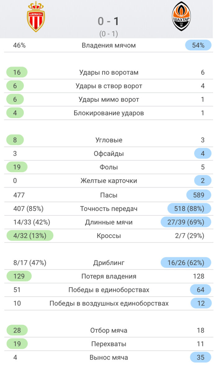 Монако дома проиграл донецкому Шахтеру, весь матч имея игровое преимущество. Это хорошо видно и в статистическом отчёте. Практически по всем параметрам Монако переиграл соперника. Кроме главного - забитые голы. Шахтёр очень рационально воспользовался одним из немногих моментов. Отметить можно также большее количество сделанных игроками Шахтёра пасов и их чуть более высокое качество. Самую высокую по баллам и главную по важности оценку получил вратарь Шахтёра Трубин. Что говорит об опасности Монако в атаке и большом количестве остроты у ворот Шахтёра. Головин получил вторую оценку среди игроков Монако. Учитывая, что он сыграл только 60 минут, это очень высокий результат. Последний раз Головин играл в Лиге Чемпионов 3 года назад в своём первом сезоне во Франции. Монако многие называли для Александра трамплином в один из топ-клубов Европы. Но для прыжка нужна игра в еврокубках. Провал в очередном еврокубковом сезоне может поставить крест на этих планах.