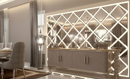 В современном мире зеркало больше не является просто функциональным объектом. Украшение интерьеров и стен зеркалами в комнатах используется дизайнерами как способ расширить пространство, изменить помещение в геометрическом плане (с помощью зеркала можно сделать потолок выше, сделать узкую комнату шире, создать эффект бесконечности с большим зеркалом на всю стену и т.д.). Высшую категорию сложности во всем многообразии зеркальных изделий можно смело отнести к зеркальное панно, представляющей собой зеркало различной конфигурации с полированной кромкой или с огранкой, объединенное в композицию. Изготовление зеркального панно начинается с составления эскиза, в котором мастера проставляют габаритные размеры будущего изделия, указывают размеры элементов. Этот этап изготовления очень важен, так как предварительный расчет изделия производится на основе эскиза. Вы также можете нарисовать предварительный эскиз зеркального панно для расчета стоимости самостоятельно, без использования графических