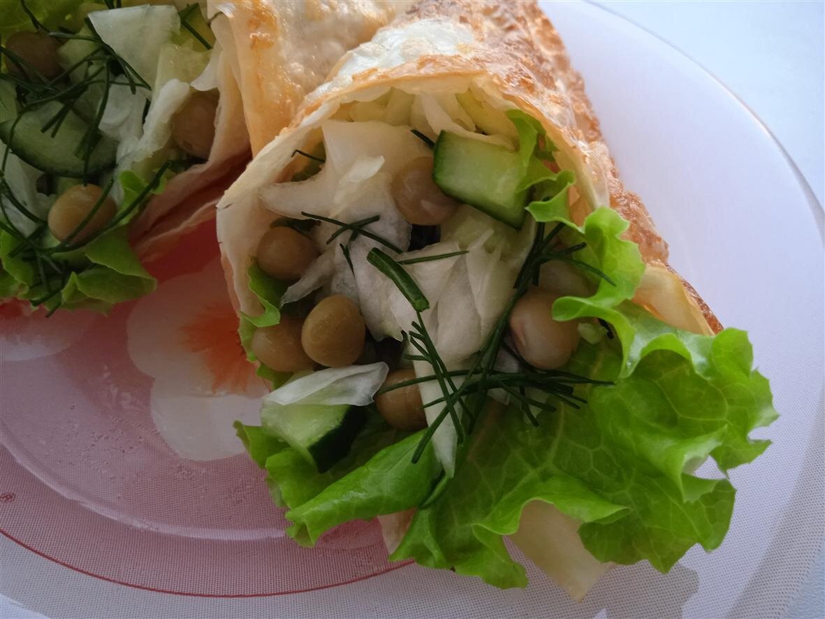 Отличным вариантом приготовления легкой и вкусной закуски станут рожки из лаваша с салатом. Они подойдут как для ежедневного меню, так и для праздничного стола благодаря своему красивому виду. А в начинку можно добавлять салат на любой вкус. Закуска готовится легко и на скорую руку, а салат можно выбирать каждый раз разный. Вот то что нам нужно, смотрите ниже. Я делала два рожка, а количество ингредиентов для салата на глаз. Ингредиенты: тонкий лаваш огурцы белокочанная капуста лист салата консервированный горошек соль укроп растительное масло Способ приготовления: Приготовьте начинку: нарежьте небольшими кубиками огурцы, нашинкуйте капусту и добавьте консервированный горошек. Посолите по вкусу, добавьте растительное масло и мелко нарубленную зелень. Хорошо перемешайте салат. Листы лаваша разрежьте на прямоугольники 10 на 20 см. Сформируйте рожки и закрепите зубочисткой. Взбейте яйцо и смажьте рожки. Отправьте в духовку при 180 градусах. Но у меня нет духовки так я выкрутилась, подж