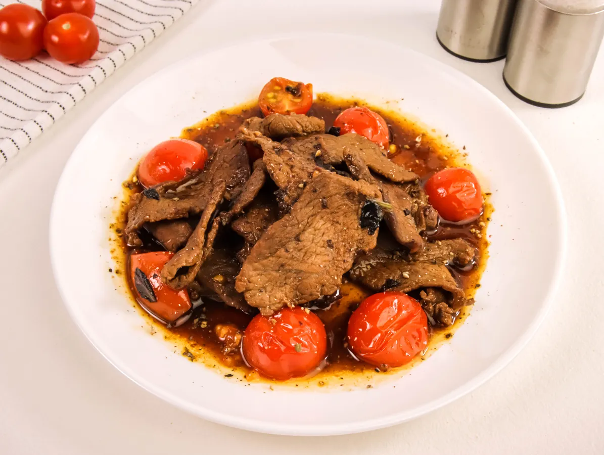 «Страчетти ди манзо» — это классический итальянский теплый салат из говядины. «Страчетти» с итальянского языка переводится как «лоскутки» или «клочки», а «манзо» — «говядина». Название для салата выбрано не случайно. Все потому что говядина нарезается очень тонкими ломтиками, которые обжариваются на сильном огне за несколько минут. Для его приготовления лучше всего использовать вырезку или другие нежные части бычка. Также традиционно в салат добавляются томаты и базилик. Ингредиенты Говяжья вырезка100 гПомидоры черри5 шт. = 100 гСоевый соус2 ст. л. = 36 гПодсолнечное масло нерафинированное1 ст. л. = 17 гБазилик5 лист = 1 гЧерный перец молотый по вкусу СДЕЛАТЬ ПОЛЕЗНЕЕ Запеките мясо цельным куском в фольге в духовке в течение 20-30 минут при 200 °С. Нарежьте его тонкими ломтиками и смешайте со свежими помидорами. Полейте салат заправкой из смеси оливкового масла и соевого соуса. ПОШАГОВЫЙ РЕЦЕПТ ПРИГОТОВЛЕНИЯ ШАГ №1 Удалите из говядины лишние пленки и прожилки. Ополосните мясо холодной