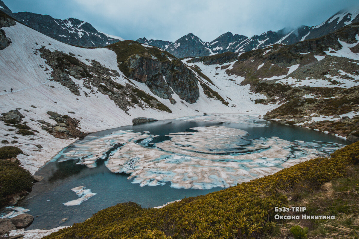 Первое озеро, на которое мы поднялись называется Сказка Кавказа. По нему в тот момент плавали льдины и не планировали таять. Людей, желающих познакомиться со Сказкой, не было. И это озеро оказалось совершенно безмолвным.