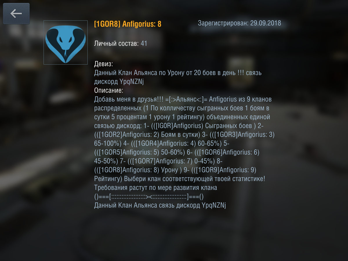 Чего только нет в Блице. Игра, мягко говоря, размеренная и сам игровой процесс многих "утомил". Чуть-чуть. Вот и пробуют некоторые игроки альтернативные вариации геймлпея. В частности, клановая движуха и свои, особые, цели и миссии в Блице. Чего стоят всякие "очковцы" и "запоры", которые просто сливают свою статку. Но сливать бои уже не модно. Есть кое-что более "витиеватее". И пример тому — андеграундный альянс "Антигориус". Идея альянса — игрок может выбирать клан под свой стиль игры. Например, одна, две три... боя в день. Или выбирать клан по статистике и рейтингу. Выглядит это примерно так: Здесь клан "Антигориус 8" для игроков с 20 боями в день. А вот как это выглядит в поиске: И да, если есть "Антигориус", то есть что-то против поставляющееся (на что указывает приставка "анти"), то есть и первоначальный "антагонист". Ну или говоря проще — альянс "Игориус". Где цель идентичная — выбор из предложенных вариантов по "стилю" игры. И, как можно догадаться, у ребят-клановщиков идет прот