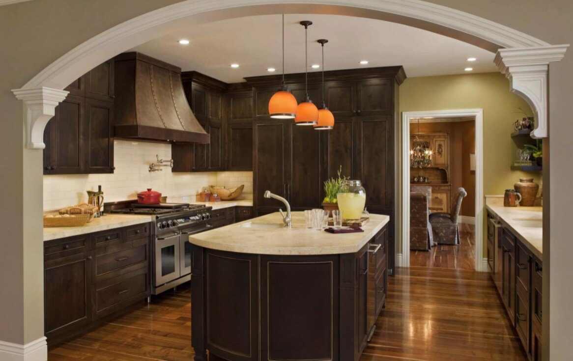 Дизайн кухни с аркой – как выполнить своими руками? Кухня с арками – находка для тех, кто не желает отказываться от своих любимых, комфортных на вид и практичных по функционалу элементов интерьера. Очень многие дизайнеры, оформляющие кухонную зону с аркообразным помещением, используют еще одну функцию, помимо функционала, – украшение комнаты: Получившийся эффект выглядит богато и неординарно, и в то же время прост. Такой способ украшения возможен благодаря способности красочных арок и колонн соединяться друг с другом на месте стыка. Соединение углов и полуарок, безусловно, выглядит эффектнее, чем их наращивание, но в этом случае существует опасность ошибок – арки могут задеть другие элементы комнаты, а это приведёт к их порче. Поэтому лучше заранее продумать все нюансы, чтобы не портить дизайн квартиры своими руками. Советы по оформлению помещения с аркадами Сделать арку с помощью гипсокартона – неплохая идея, особенно для квартиры, объединенной с лоджией и балконом. Для того,