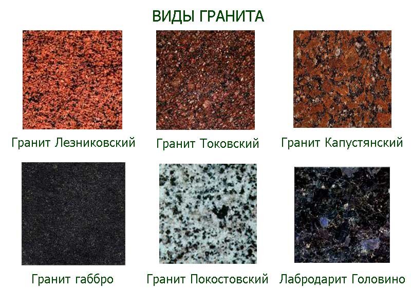 Существует большое количество разновидностей гранита, благодаря этому появляется множество решений по оформлению мемориального комплекса. Всё чаще люди выбирают гранитные памятники, так как гранит наиболее долговечный материал. Гранит добывают в различных местах. Он имеет разные свойства, вид и цвет. Гранит можно разделить на виды по месту его добычи. Карельский гранит чёрный с серыми вкраплениями, прочный, в основном применяется для изготовления надгробий. Мансуровский гранит белый с зеленоватыми включениями, мелкозернистый. Капустинский гранит добывают в Украине, имеет красно-чёрный цвет, применяют при изготовлении монументов. Лезниковский гранит тёмно-розового цвета, обладает повышенной плотностью, устойчив к атмосферным влияниям, применялся для облицовки мавзолея Ленина. Гранит Возрождение чёрно-белого цвета, имеет крупные включения разных оттенков. Финский гранит крупнозернистой структуры с зелёными вкраплениями полевого шпата. Природный гранит по структуре складывается из различ