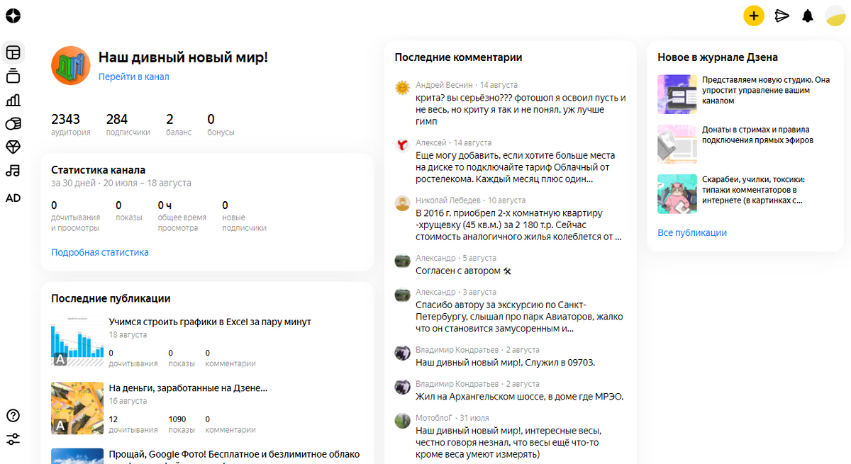 Яндекс Дзен взял и внезапно обновил своё визуальное оформление. Получилось сомнительно как-то. Разбираемся, что произошло - тема хайповая, потому что народ не понимает - а, собственно говоря, зачем? Боковая панель Итак, навигация по разделам Дзена происходит теперь через боковую раскрывающуюся панель. В свёрнутом виде - это просто иконки, но только мышку подводишь, как сразу выезжает текст. Сомнительное удобство, выезжающий текст перекрывает часть контента страницы. Из-за появившейся боковой панели текст на некоторых страницах не отцентрован. Зайдя, например, на страницу "Монетизация", верхний блок текста смещён влево, не красиво: Блоки - "виджеты" Главную страницу блогера "захватило" 4 блока, которые я называю "виджеты": Информация о блоге пользователя теперь съехала влево, уступив центральное место комментариям. В обсуждении нового дизайна я предложил всё таки сделать информацию о блоге по центру, влево можно переместить, например, виджет под номером 4. Вообще, будет идеально, если