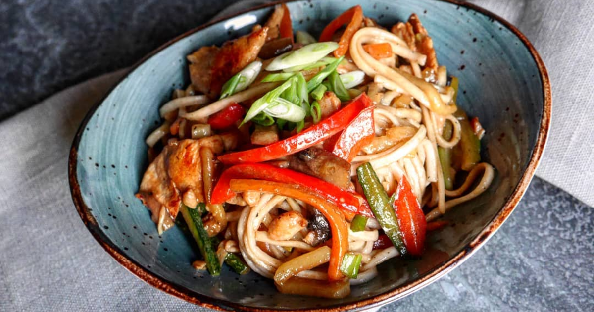 Быстрый, легкий, простой и очень вкусный ужин! Лапша вок с курицей и овощами получается совсем не сухой (в отличие от обычных отварных макарон) за счет добавления большого количества овощей и ароматного соевого соуса. Ингредиенты: Шаг 1 Как сделать вок с курицей? Приготовьте все продукты. В первую очередь займитесь овощами и курицей. Позже, когда кура и овощи будут уже готовиться на сковороде, займитесь лапшой удон. Итак, вымойте и очистите все овощи, удалите плодоножку у перца и очистите его от семян. Морковь лучше всего нашинковать на слайсере тонкой соломкой. Но если такого не имеется, то нарежьте ее самостоятельно длинными полосками (3-5см.), толщиной примерно 2 мм. Шаг 2 Теперь нарежьте болгарский перец (можно использовать любой, но с использованием красного, блюдо будет выглядеть более красочным), продолговатыми нетолстыми полосками (3-5см.) с помощью ножа. Шаг 3 Репчатый лук нарежьте мелкими кубиками. Зубчик чеснока мелко порубите ножом или измельчите с помощью специального прес