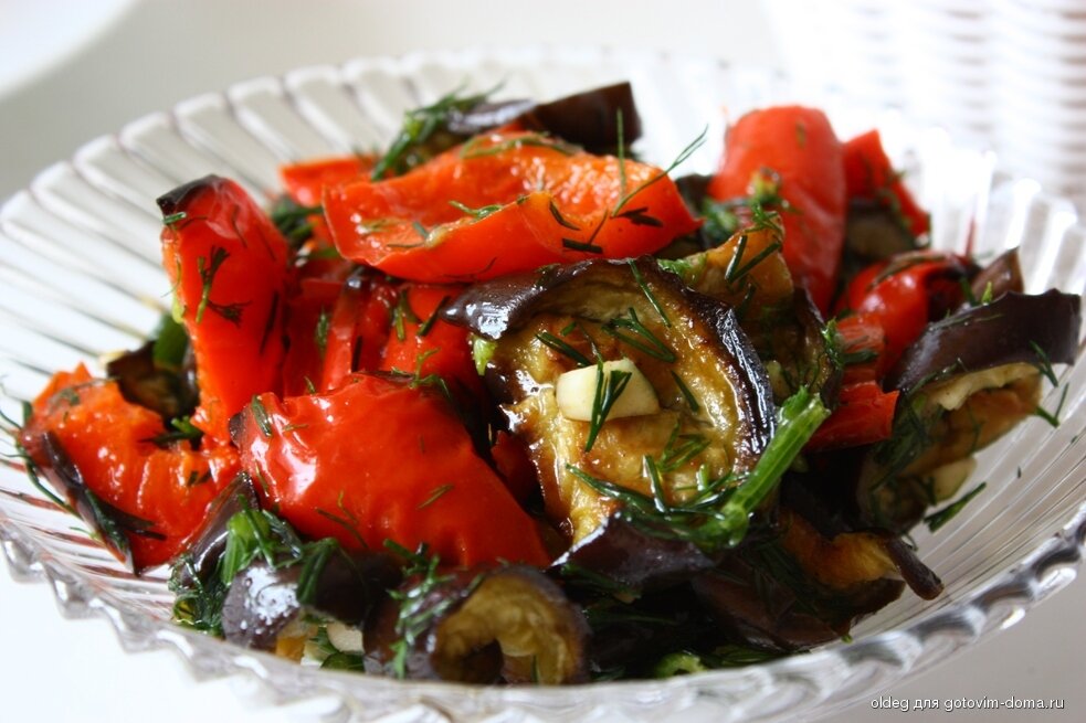 Нарезаем баклажаны с перцем крупными ломтиками 2-3см(можно кружочками, полосками, кому как нравится), кладем в миску немного поливаем растительным маслом и перемешиваем. Тем временем разогреваем духовку до 200 градусов. Выкладываем баклажаны с перцем на противень и отправляем в духовку минут на 20 и запекаем до готовности (зависит от вашей духовки и размера кусочков может и дольше).