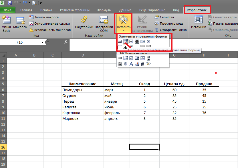 Способ 3 В данном способе мы будем вставлять на лист новый объект с привязкой к диапазоном на листе. Что будем делать: 1. Открываем вкладку Разработчик. Если так получилось ,что этой вкладки не видно, то для: - Excel 2007 нажимаем на кнопку Офис – Параметры Excel –флажок Отображать вкладку Разработчик на ленте - Excel2010-2013 щелкните правой кнопкой мыши по ленте, выбираем команду Настройка ленты и включаем отображение вкладки Разработчик. 2. На панели нажимаем на значок выпадающего списка в элементах управления форм – Поле со списком, щелкните по значку и нарисуйте небольшой горизонтальный прямоугольник –будущий список. Чтобы рисовать ровно по границам ячеек удерживаем клавишу Alt 3. Щелкните по нарисованному списку правой кнопкой мыши и выбираете команду Формат объекта, появится диалоговое окно, в данном окне задайте: Формировать список по диапазону –выделите ячейки с наименованиями товаров, которые должны попасть в список Связь с ячейкой – укажите ячейку, куда нужно выводить поря